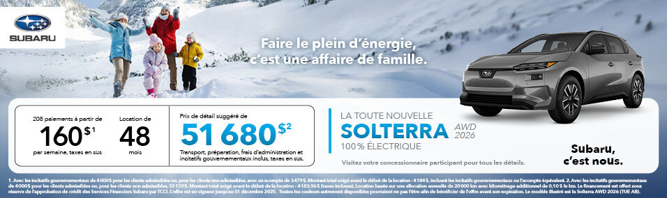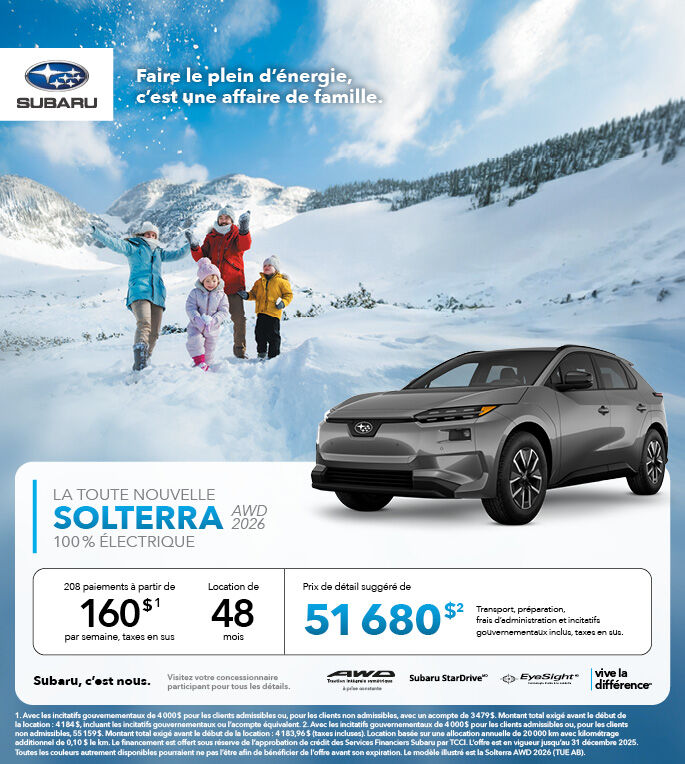 Le respect de votre vie privée est fondamental pour nous. Pour savoir comment Subaru Canada, Inc. protège les renseignements personnels que vous lui communiquez, veuillez consulter notre Politique de protection des renseignements personnels.