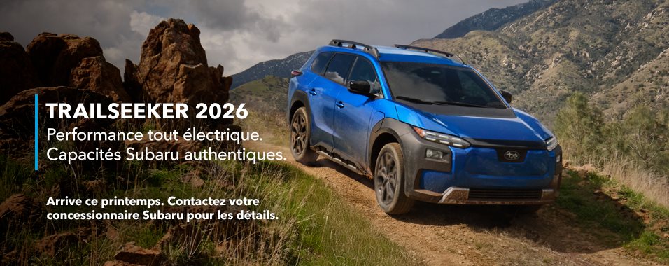 Voici la toute nouvelle Subaru Trailseeker 2026 : le savoir-faire Subaru, entièrement électrifié. Pensée pour la vie au Canada, la Trailseeker conjugue des performances électriques éprouvées avec la robustesse et la polyvalence que les conducteurs attendent d’un authentique VUS Subaru.