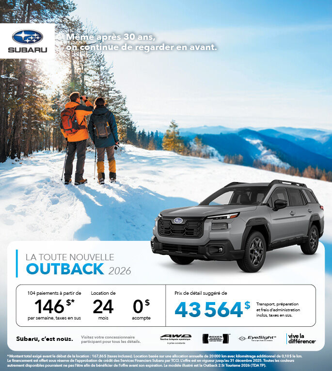 Le respect de votre vie privée est fondamental pour nous. Pour savoir comment Subaru Canada, Inc. protège les renseignements personnels que vous lui communiquez, veuillez consulter notre Politique de protection des renseignements personnels.
